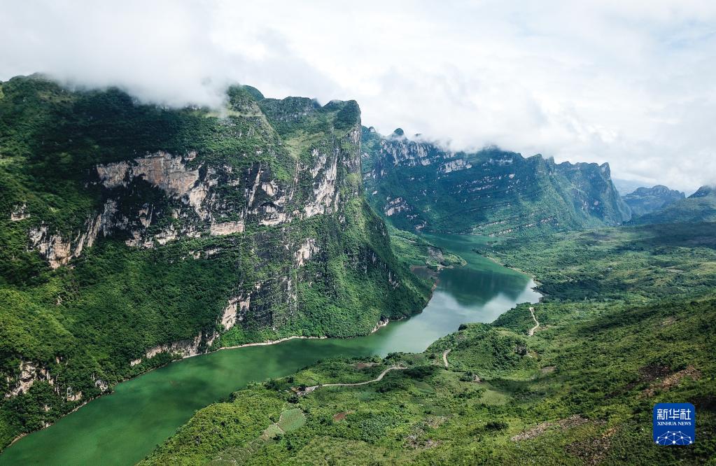 貴州省北盤(pán)江大峽谷國家濕地公園風(fēng)貌(2018年8月7日攝,無(wú)人機照片)。