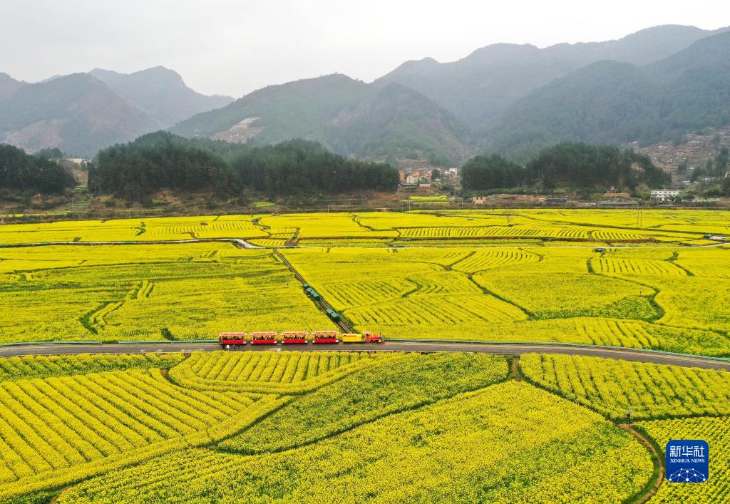 游客乘坐觀(guān)光小火車(chē)在貴州省貴定縣盤(pán)江鎮“金海雪山”景區觀(guān)賞油菜花海(3月12日攝,無(wú)人機照片)。
