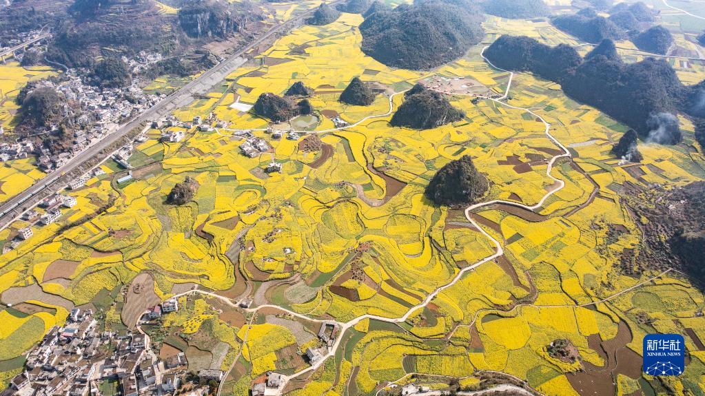 貴州省六盤(pán)水市六枝特區木崗鎮抵簸村的油菜花田(3月9日攝,無(wú)人機照片)。