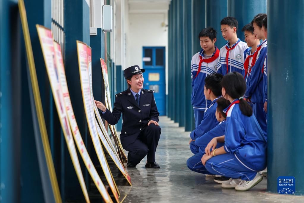 4月14日,在貴州省黔東南苗族侗族自治州丹寨縣興仁鎮中學(xué),民警李嘉怡為學(xué)生講解校園反恐防暴知識。