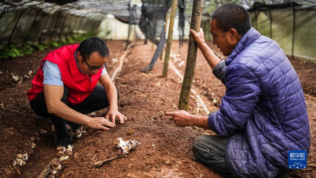 4月14日,農技工作者在六盤(pán)水市鐘山區汪家寨鎮那羅村查看皺環(huán)球蓋菇的種植情況。