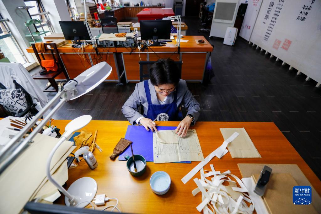 4月14日,在廣西壯族自治區圖書(shū)館古籍保護中心的工作室內,黃玉杏正在修復古籍。