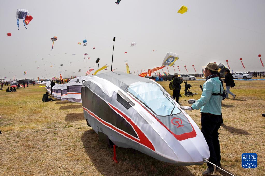 4月15日,動(dòng)車(chē)造型的風(fēng)箏準備放飛。