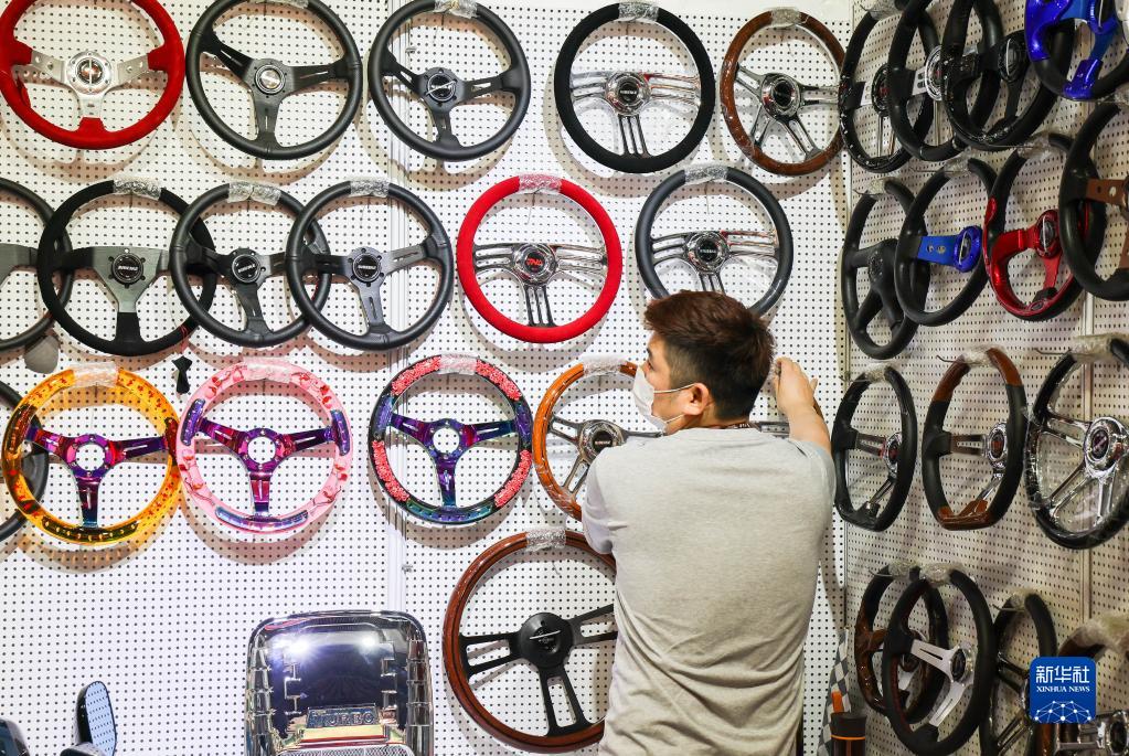 4月15日,參展商在廣交會(huì )汽配展區展示方向盤(pán)產(chǎn)品。