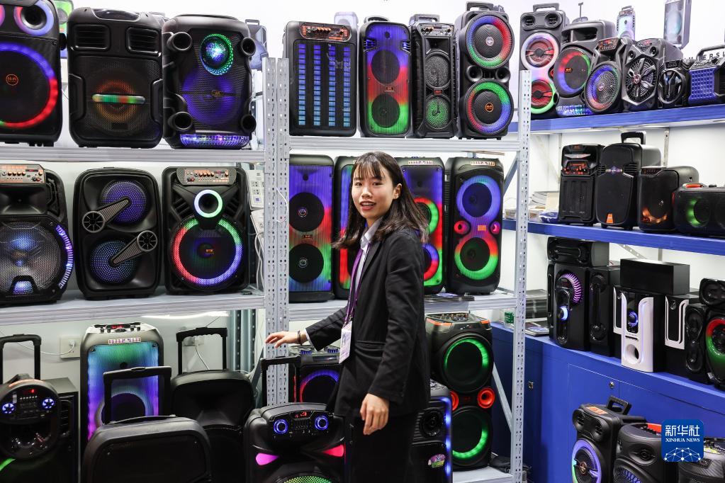 4月15日,參展商在廣交會(huì )電子消費品和信息產(chǎn)品展區整理音響產(chǎn)品。