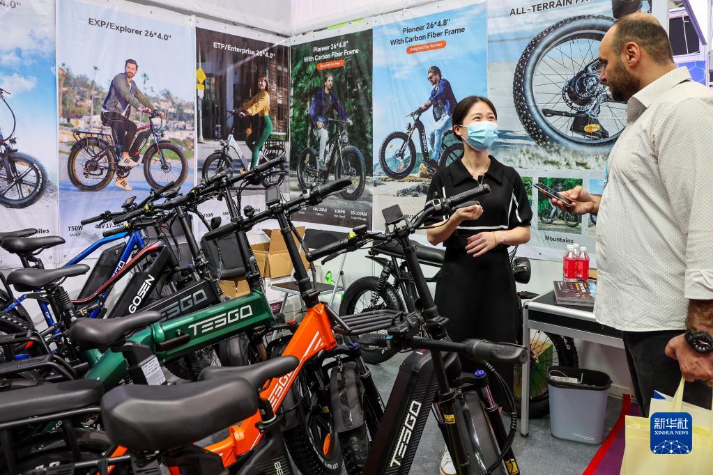 4月15日,采購商(右)在廣交會(huì )新設置的新能源及智能網(wǎng)聯(lián)汽車(chē)展區了解中國電動(dòng)自行車(chē)產(chǎn)品。