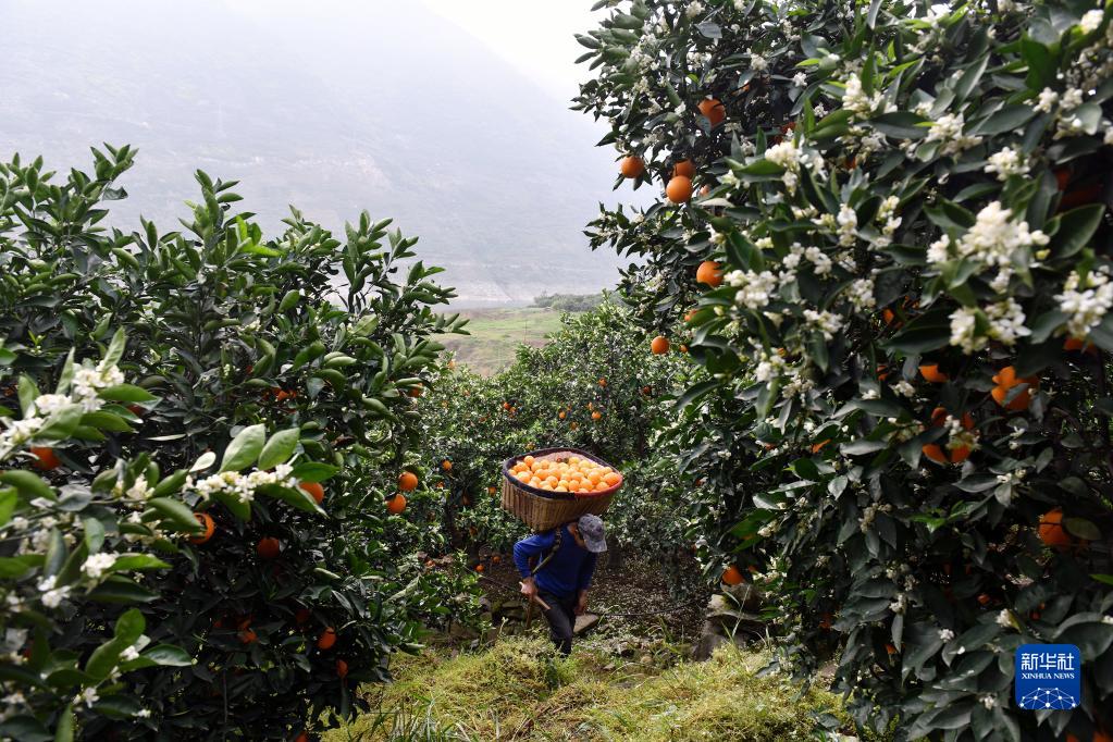 眼下,有“中國臍橙之鄉”美譽(yù)的三峽庫區湖北省秭歸縣長(cháng)江兩岸橙花盛開(kāi),晚熟臍橙掛滿(mǎn)枝頭,花果同樹(shù)的橙樹(shù)與峽江景觀(guān)相映如畫(huà)。