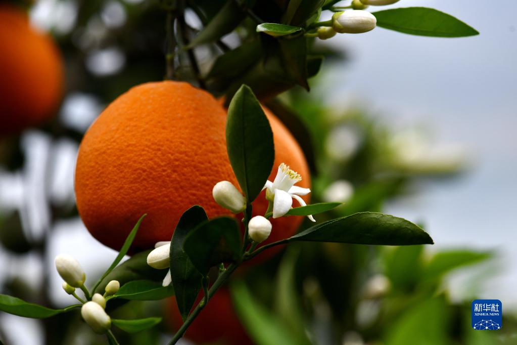 4月15日在秭歸縣歸州鎮香溪村拍攝的花果同樹(shù)的晚熟臍橙。
