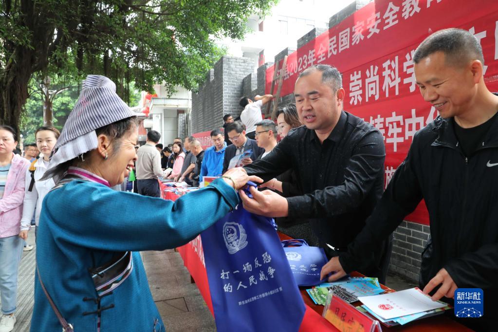 4月15日,貴州省黔東南苗族侗族自治州榕江縣機關(guān)單位工作人員在給居民發(fā)送國家安全知識宣傳資料。