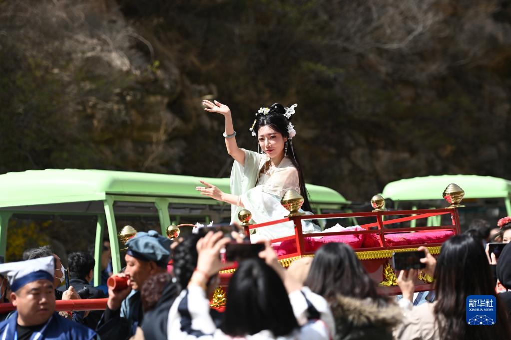 4月15日,游客在天津市薊州區梨木臺景區觀(guān)看漢服表演。