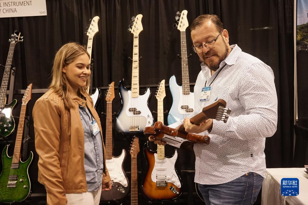 4月13日,在美國加利福尼亞州阿納海姆會(huì )展中心,參觀(guān)者在中國貴州正安吉他產(chǎn)業(yè)園一家公司展位觀(guān)看樂(lè )器。