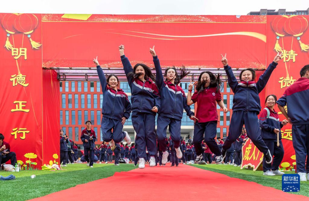 4月15日,黔西第一中學(xué)幾名女生穿過(guò)“成人門(mén)”后雀躍歡呼。
