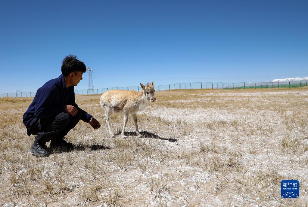 4月15日,索南達杰保護站巡山隊員才文多杰與被救助藏羚羊幼崽互動(dòng)。