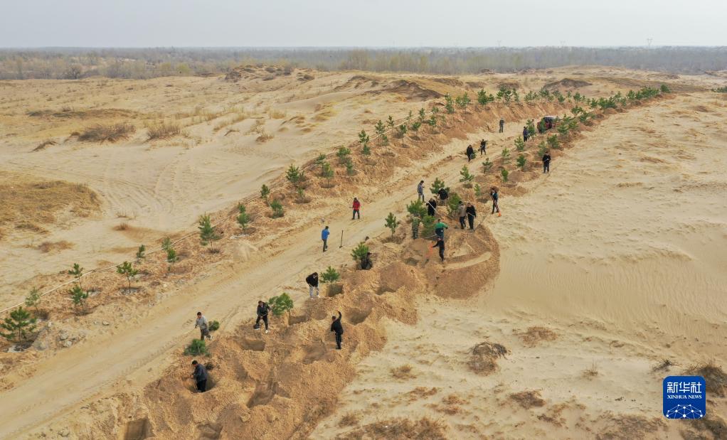 4月15日,在內蒙古通遼市科爾沁左翼后旗,治沙工人在科爾沁沙地植樹(shù)造林(無(wú)人機照片)。