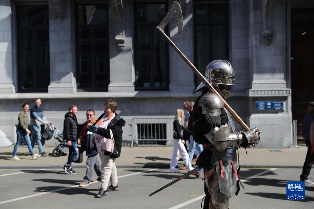 4月15日,一名身著(zhù)盔甲的演員在比利時(shí)那慕爾市傳統民俗日活動(dòng)上行進(jìn)。