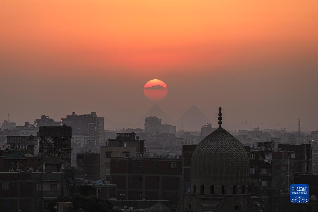 這是4月15日在埃及開(kāi)羅拍攝的吉薩金字塔群日落景色。
