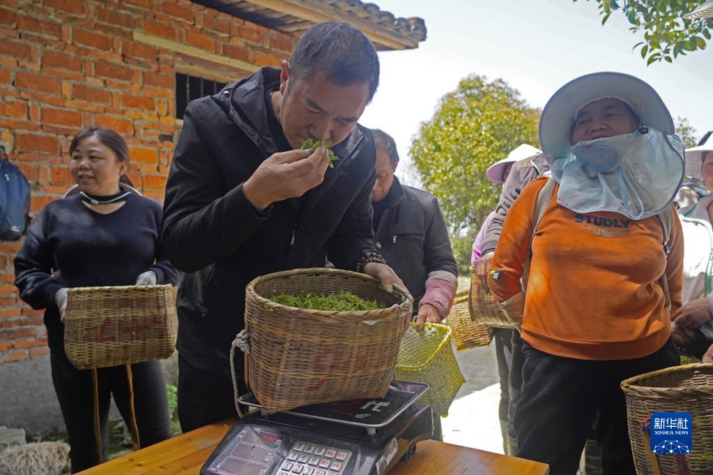 劉煌平(左二)在港背村的茶園里收購剛剛采摘的春茶(4月7日攝)。