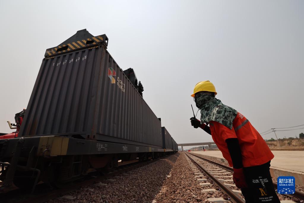 4月15日,老中鐵路有限公司的工人在老撾萬(wàn)象南站換裝場(chǎng)工作。