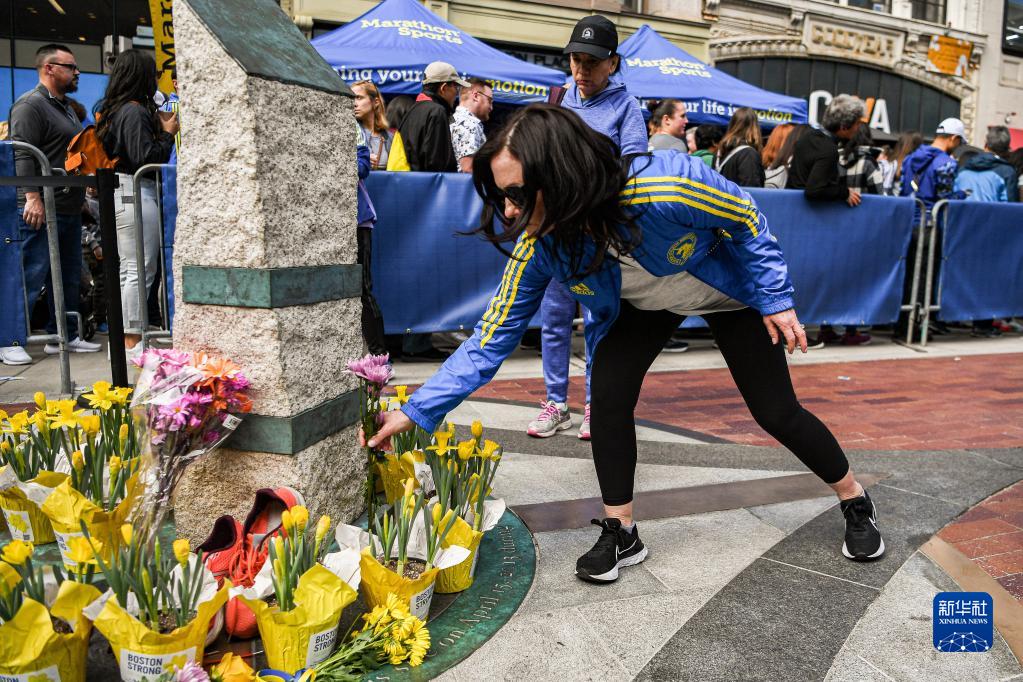 4月15日,在美國馬薩諸塞州波士頓,一名女子擺放鮮花悼念波士頓馬拉松爆炸案遇難者。