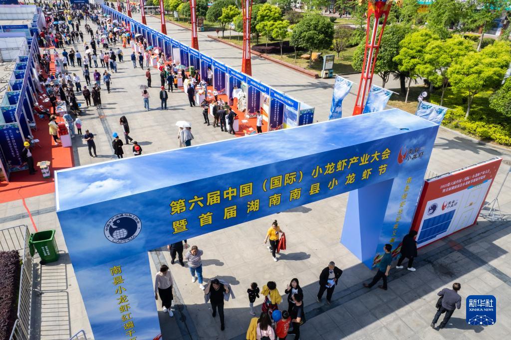 4月16日拍攝的第六屆中國(國際)小龍蝦產(chǎn)業(yè)大會(huì )小龍蝦展銷(xiāo)會(huì )(無(wú)人機照片)。