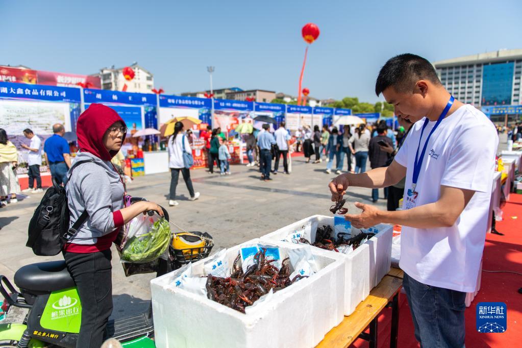 4月16日,在益陽(yáng)市南縣南洲廣場(chǎng),參展商(右)向觀(guān)眾展示小龍蝦。