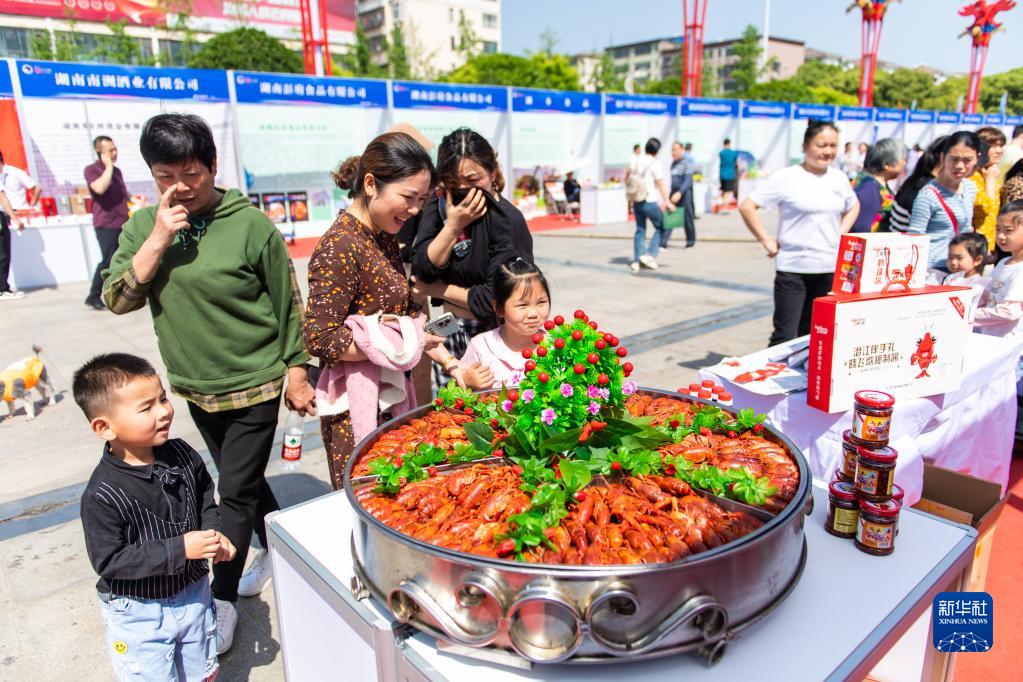 4月16日,在益陽(yáng)市南縣南洲廣場(chǎng),觀(guān)眾在觀(guān)賞小龍蝦拼盤(pán)。