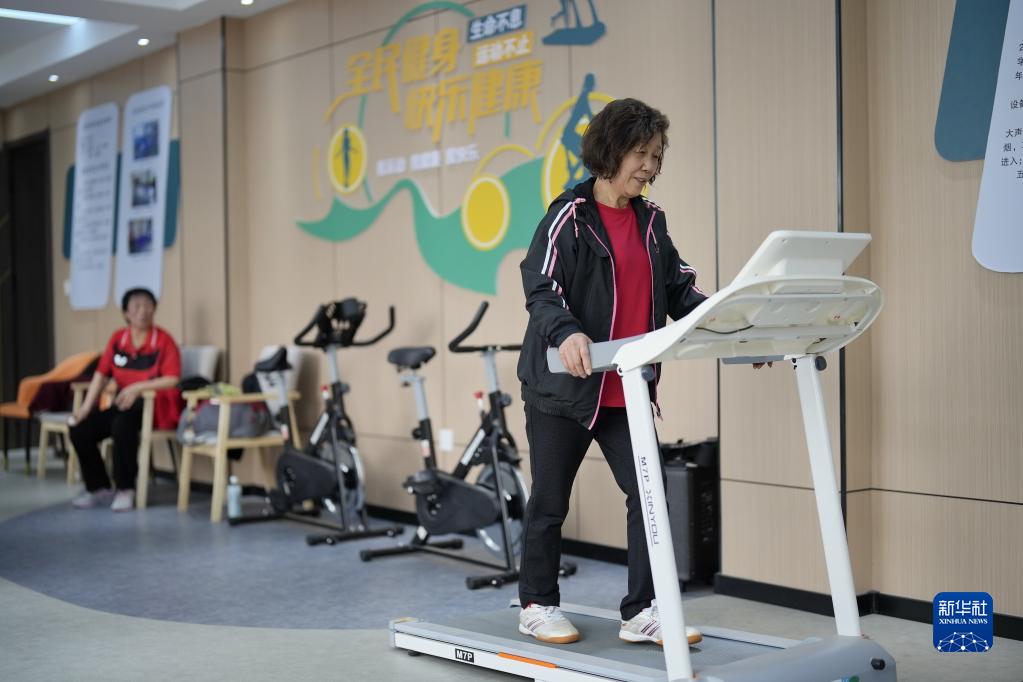 4月16日,老年人在唐山市豐南區青年路街道新興社區養老服務(wù)中心內健身。