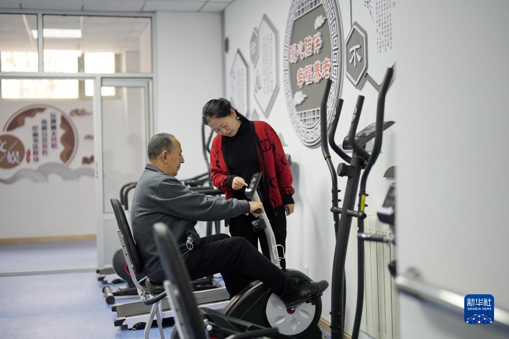 4月16日,老年人在唐山市豐南區胥各莊鎮祥云社區養老服務(wù)中心內健身。