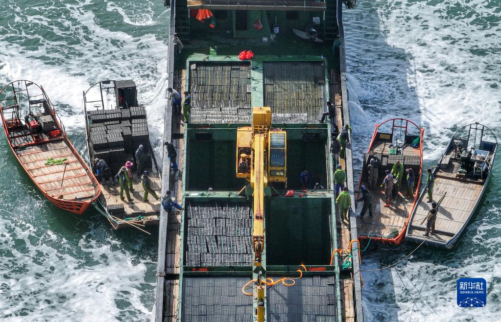 4月16日,在山東省榮成市愛(ài)倫灣海域,養殖工人們駕駛漁船卸載鮑魚(yú)(無(wú)人機照片)。