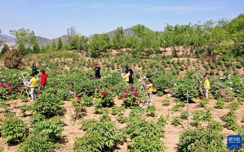 4月16日,老師帶領(lǐng)小朋友在白臺峪村牡丹農業(yè)產(chǎn)業(yè)園內寫(xiě)生(無(wú)人機照片)。