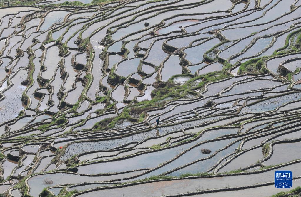 4月16日,在貴州省黔東南苗族侗族自治州從江縣加榜鄉黨扭村,村民從梯田上走過(guò)。