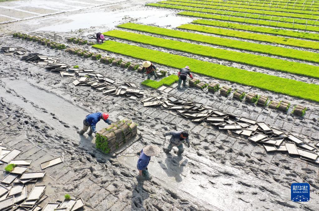 4月16日,在浙江省樂(lè )清市城東街道的一片秧田里,農民在搬運秧苗(無(wú)人機照片)。