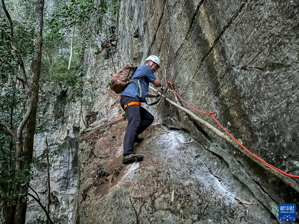 3月15日,聯(lián)合科考隊成員、廣西植物研究所的王斌在科考途中攀爬巖壁。