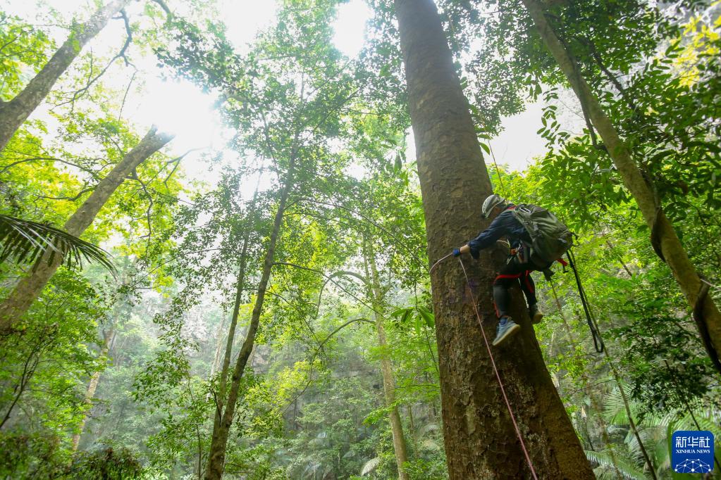 3月15日,聯(lián)合科考隊成員、南寧藍天救援隊的黃賢銘在測量望天樹(shù)胸徑。