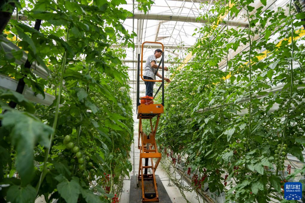 4月17日,在河北省永清縣龍虎莊鄉農業(yè)農村部規劃設計研究院永清精準試驗基地內,工作人員對西紅柿進(jìn)行繞蔓。