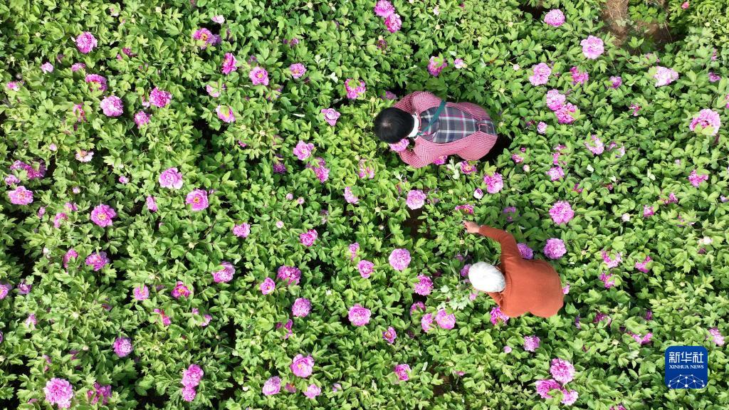 4月17日,河北省柏鄉縣十里鋪村花農在牡丹種植園里采摘牡丹鮮切花(無(wú)人機照片)。