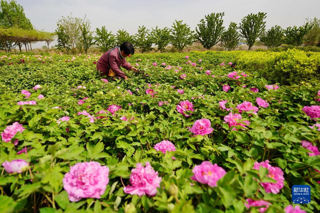 4月17日,河北省柏鄉縣十里鋪村花農在牡丹種植園里采摘牡丹鮮切花。
