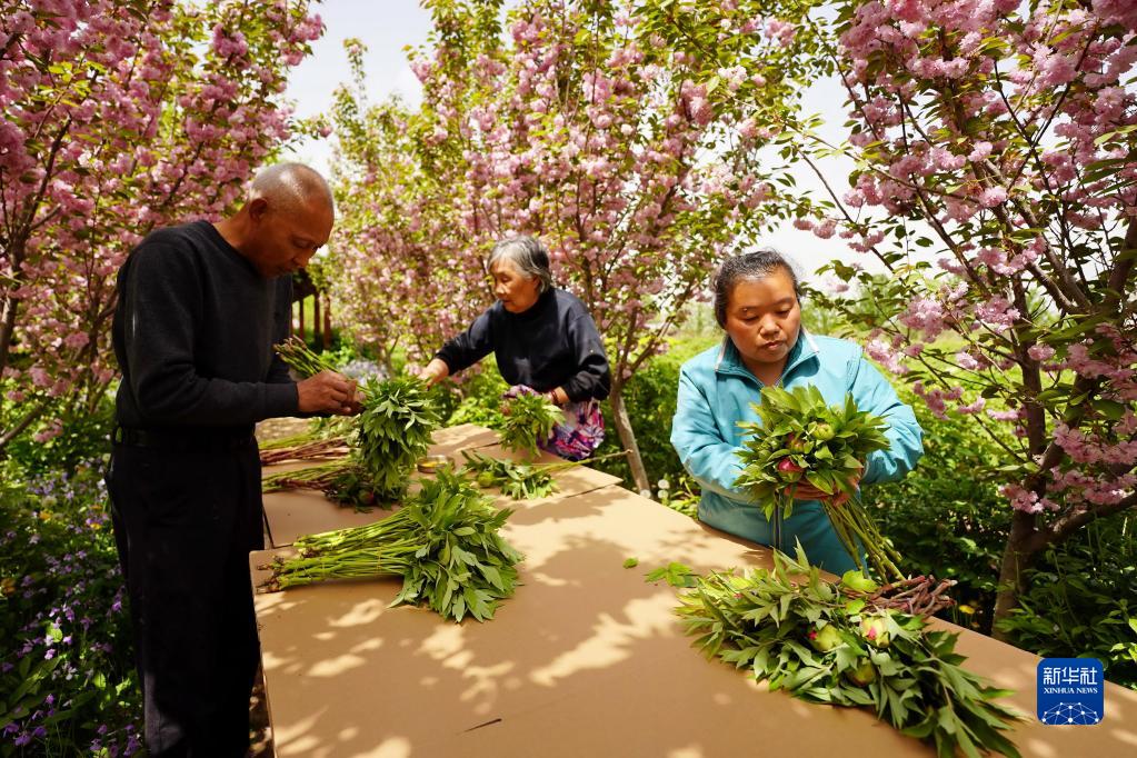 4月17日,河北省柏鄉縣十里鋪村花農在整理剛剛采摘的牡丹鮮切花。
