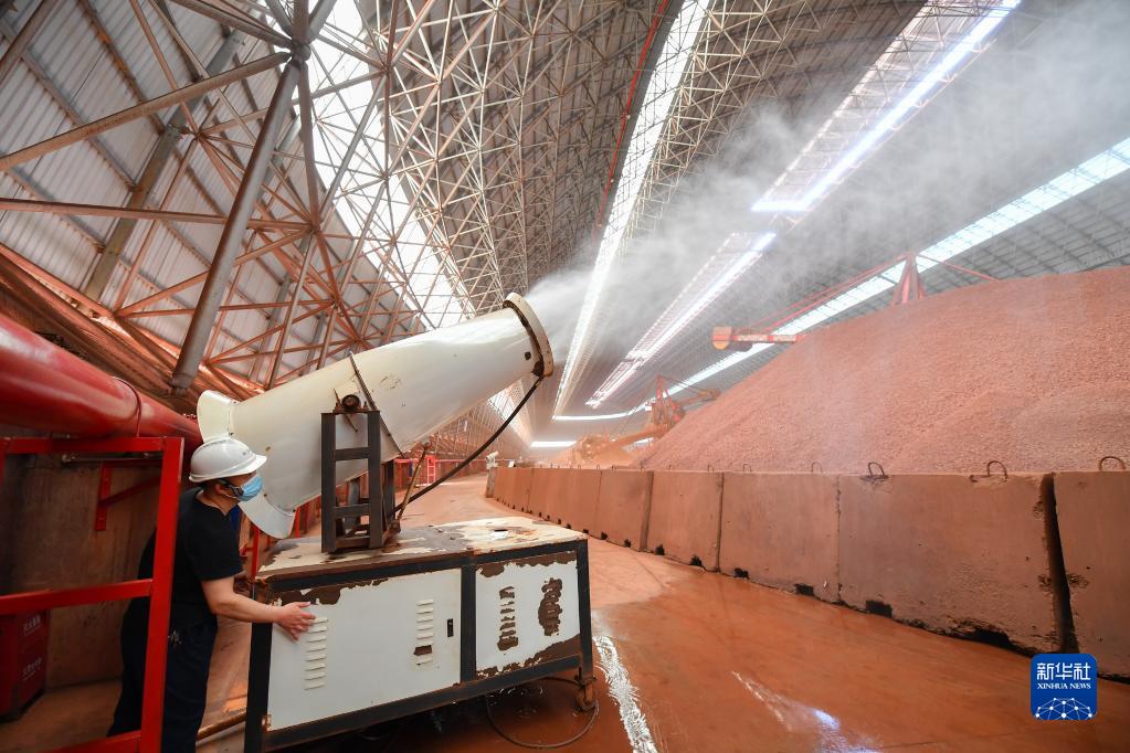 4月17日,在湖南省岳陽(yáng)市城陵磯港“膠囊”形散貨大棚內,工作人員查看降塵設備運行情況。