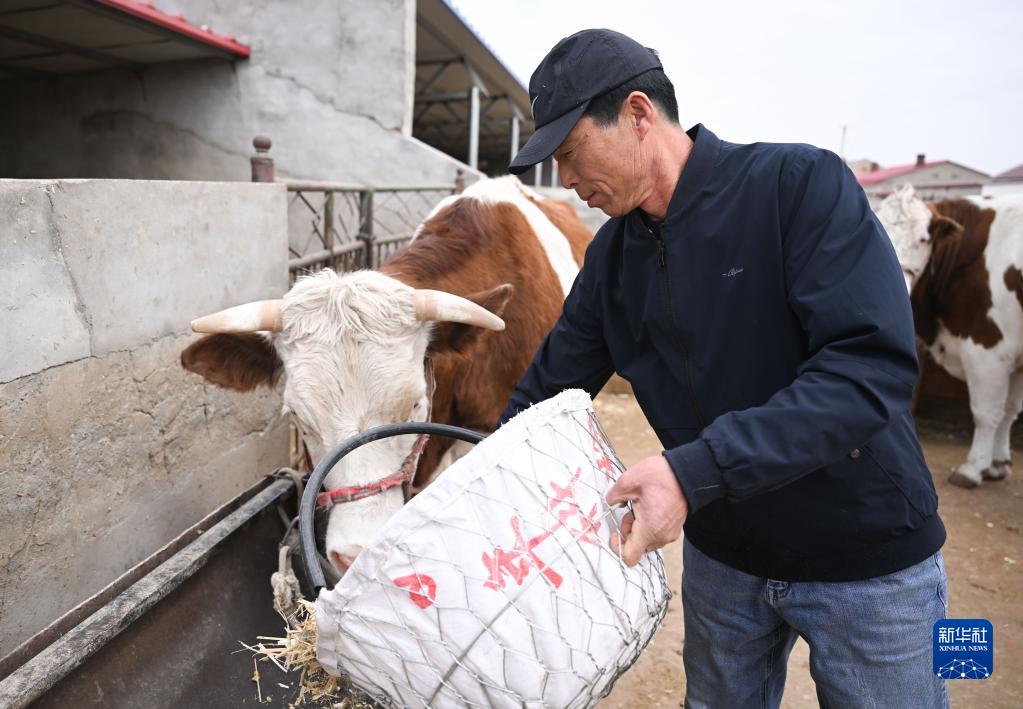 4月13日,在通遼市科爾沁左翼中旗舍伯吐鎮,養牛大戶(hù)王連柱在家中的牧場(chǎng)喂牛。