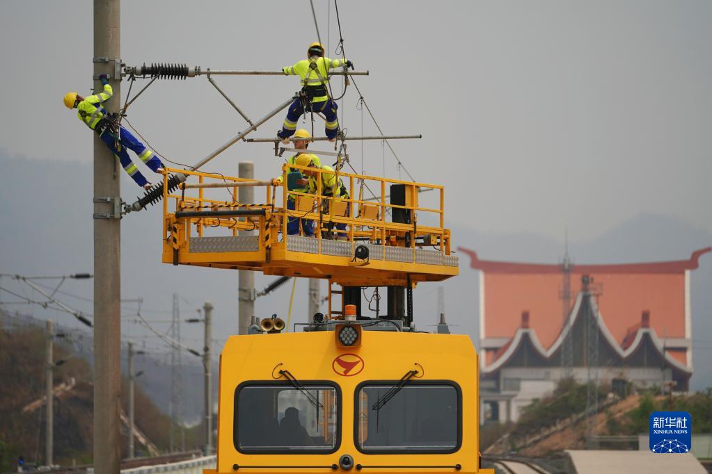 4月17日,瑯勃拉邦維保管理中心的工人在老撾瑯勃拉邦站附近進(jìn)行接觸網(wǎng)維修保養演練。