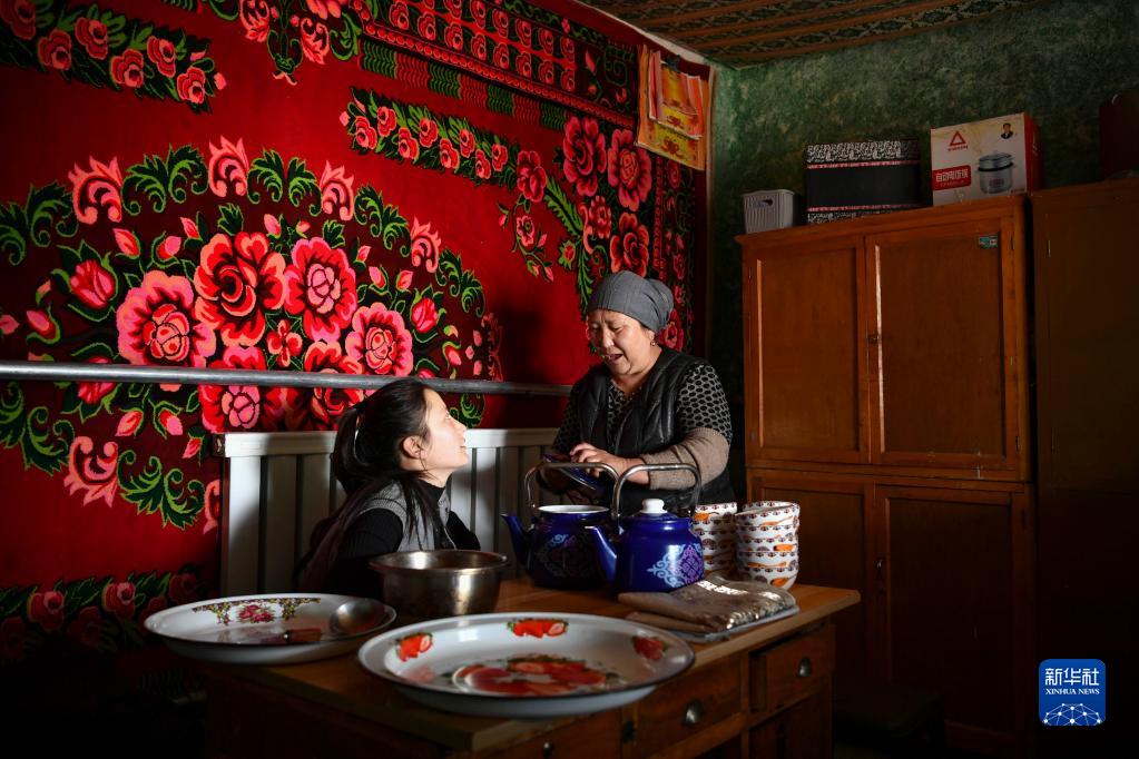午飯后,巴哈提(右)在家中洗碗,小女兒昆樹(shù)阿克在一旁依戀地看著(zhù)母親,有說(shuō)有笑(2月12日攝)。身后墻上右上角,掛著(zhù)30多張昆樹(shù)阿克所獲的獎狀。