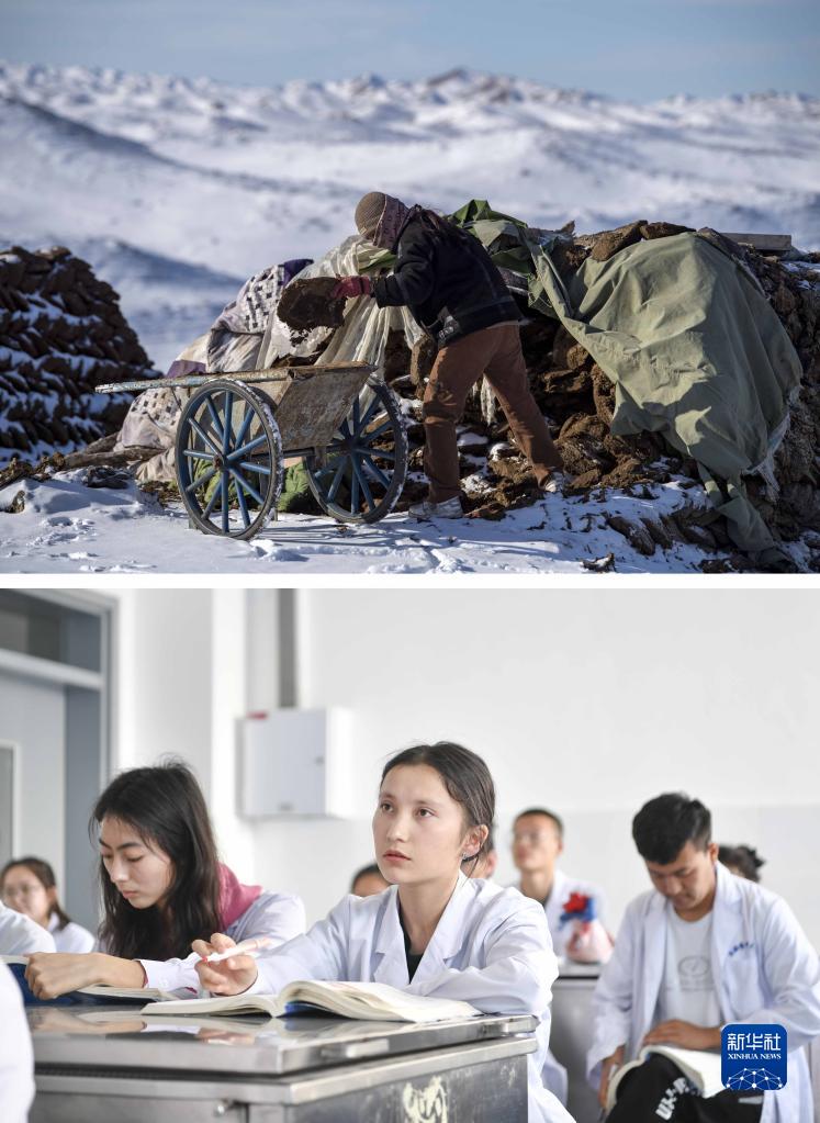 拼版照片:上圖為寒假時(shí),昆樹(shù)阿克在家幫忙干活,撿拾牛糞用作取暖的燃料(2月14日攝);下圖為在新疆醫科大學(xué)(雪蓮山校區)1號實(shí)驗樓教室,昆樹(shù)阿克(中)和同學(xué)一起上系統解剖學(xué)課程(4月17日攝)。