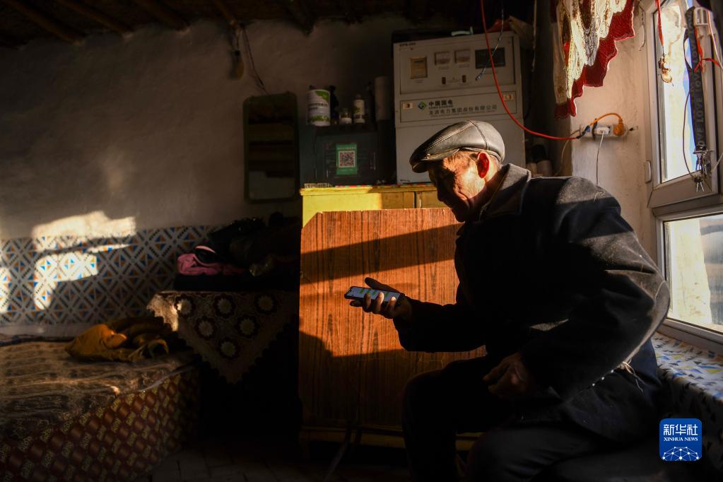 從草場(chǎng)上看完羊群后回來(lái),哈布得拉什么在家中給小女兒昆樹(shù)阿克發(fā)語(yǔ)音消息,由于手機信號不穩定,老人靜靜等待消息發(fā)出(4月13日攝)。