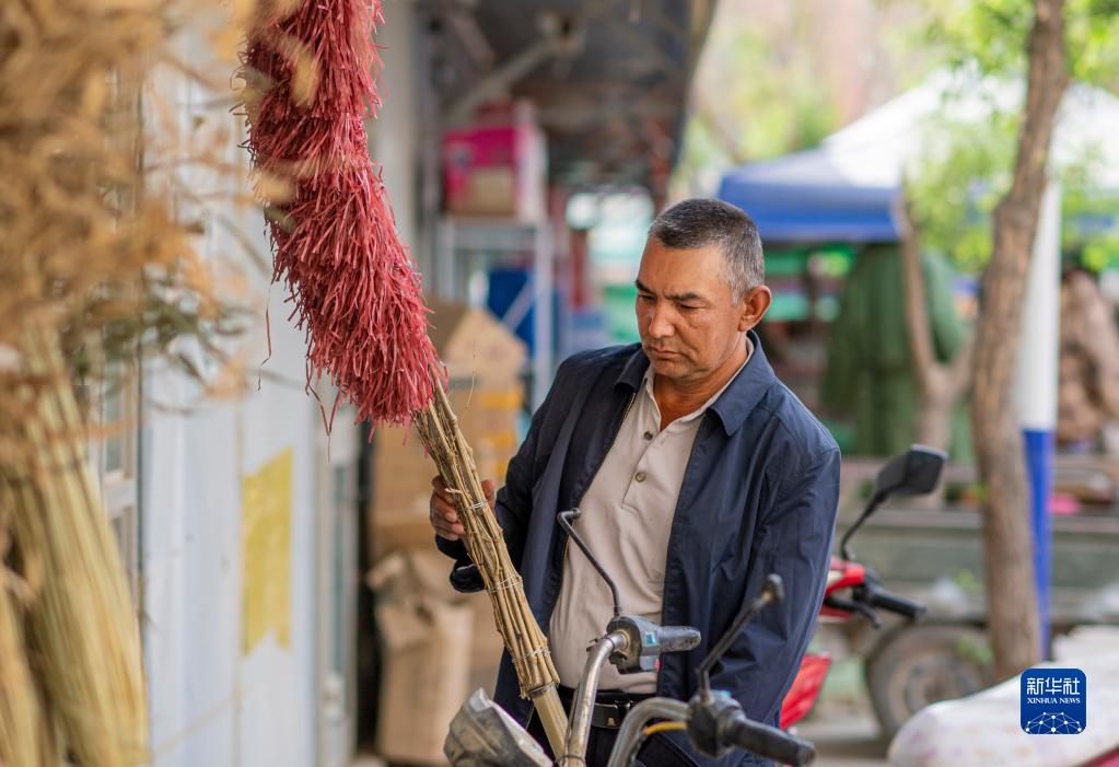 4月16日,在葉城一處農貿市場(chǎng)內,艾尼瓦爾·艾買(mǎi)爾挑選用來(lái)清掃陵園的掃帚。