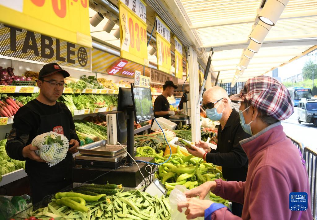 4月18日,市民(右)在位于北京市朝陽(yáng)區柳芳公交場(chǎng)站東北角的“公交便民驛?!边x購蔬菜。