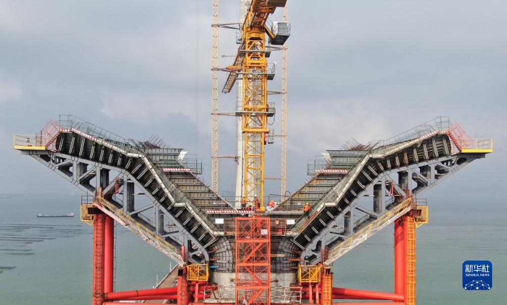 4月18日,由保利長(cháng)大承建的黃茅海大橋中塔順利封頂。至此,黃茅??绾Mǖ赖母邫诟鄞髽蚝忘S茅海大橋共5座主塔全部封頂。