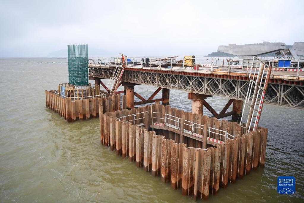 4月18日,工人在黃茅??绾Mǖ傈S茅海大橋進(jìn)行墩柱基樁圍堰施工。