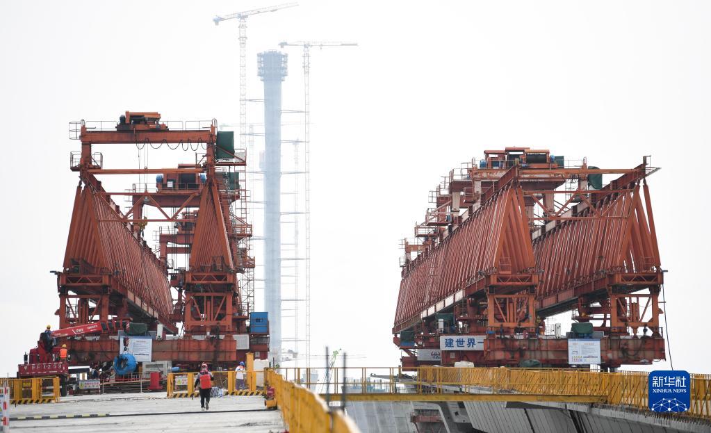 這是4月18日拍攝的在黃茅??绾Mǖ傈S茅海大橋上作業(yè)的架橋設備。