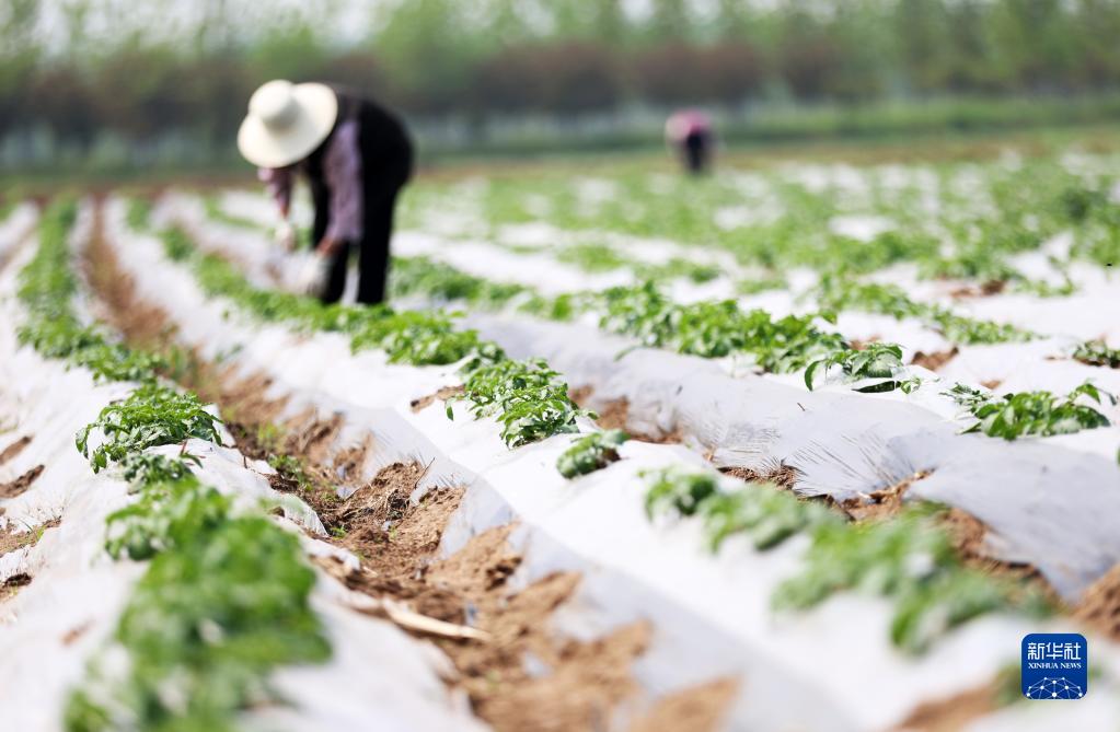 4月18日,山東省臨沂市郯城縣郯城街道農民在土豆田間勞作。